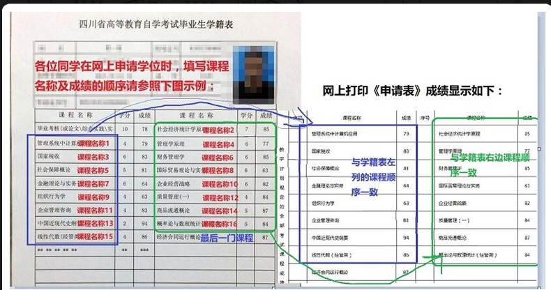 注意2:自考毕业生网上申请时,需要在“其它信息填写”中自行填报课程名称及成绩,为保证最后网上打印的《学位申请表》中课程顺序符合要求,请务必按下图所示顺序填报: